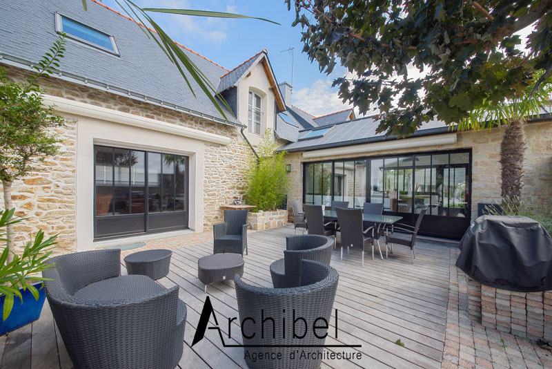 L’extension est largement vitrée avec un rythme vertical des vantaux.