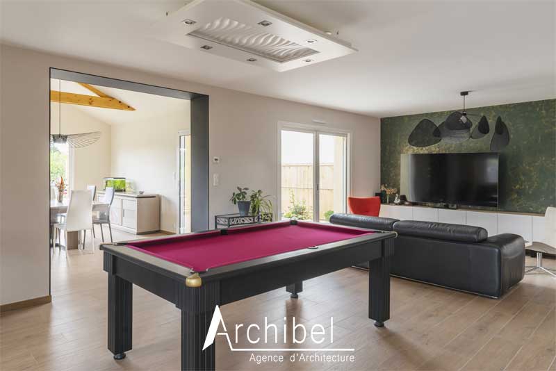 L’ancienne pièce de vie est consacrée au salon avec billard qui articule la gestion de la circulation vers les différentes pièces de la maison.